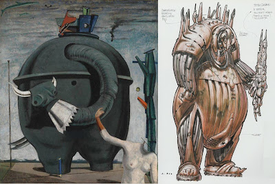 The huge entity's shapes like a diving bell displays elements of both an elephant and in the end of its trunk, the horns of a bull. Fish are seen to be flying through the air that might make one ask if was set under water. With its trunk, it also resembles an oversized vacuum cleaner and perhaps vacuum cleaners would become more and more like the thing as the years went by.