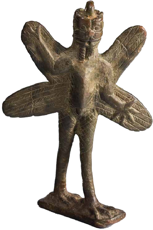 - Amulet of Pazuzu, Iraq, ca. 800-600 B.C. Bronze, 14.0 cm H, 9.3 cm W Purchased in New York, 1943 OIM A25413. The demon Pazuzu represented by this figurine stands like a human but has a scorpion's body, feathered wings and legs, talons, and a lion-like face on both front and back. Pazuzu, the "king of the evil wind demons," was not entirely unfriendly to mankind. As an enemy of the dreaded Lamashtu demon, bearer of sickness especially to women and children, Pazuzu is often portrayed on amulets used as protection in childbirth. The ring at the top of this figurine suggests that it was such an amulet. (oi.uchicago.edu/)