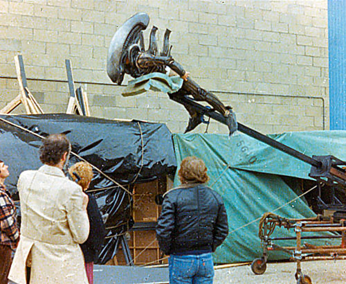 - Cinefex: For its first appearance, Ridley Scott wanted to have the full-size alien perched on one of the ship's retractable landing legs. To maintain the gravity-defiant position, Bolaji Badejo was suspended on a wire rig. Since the scene called for Brett to be swept from his feet and carried bodily into the tower, a separate harness and wire rig had to be employed for Harry Dean Stanton as well. (Cinefex 1, p59)