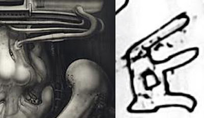The pale horizontal phallic form becomes the front of the Alien head, while the split side of the similar phallic form below that is less bright perhaps becomes the mouth.