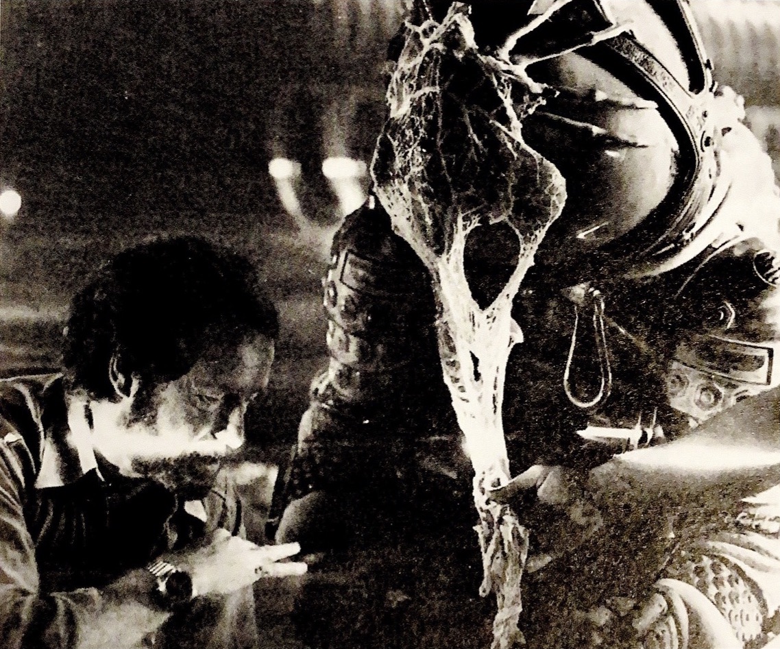 So we worked out a method of, as it was about to open, it kind of went... like that, lists a little bit, and then he looks in it again and inside are my hands with two rubber gloves on, washing-up gloves. All l'm doing is going... like that. And so that was how that was done. Then of course he comes and looks into the aperture, it opens, he backs off, we say ''Don't go there!'' He goes there, looks in, and what he's staring at is what they call ''Nottingham Lace'', which is fundamentally cow's stomach. That lacy, fleshy stuff is what we call tripe. So l got white, plastic buckets full of it. l had to put on a white coat and gloves when handling this stuff, and l just dressed it. l couldn't find a whiplash effect of anything that you made, like a hose, that was delicate enough. l'd seen this intestine, sheep's intestine, which is actually beautiful. lt's gossamer. lt's got little lines in it. lt was in fragments cos all you do is cover the bits. lt's not enough to have him look, then it explodes. You need every moment of it, and slowed down, because it was really fast. You turn an airline on and it goes ''whash!'' - it happens in less than a second. l think we stretched that to maybe one and a half seconds. And then it hits him. As he goes back, l've already got it attached to his face. So you need that bridge between him coming in to look, him looking in, what he sees - this is like that - explosion, up into the camera, then cut to where l've got this attached to his face as he falls backwards.(Alien quadrology documentary) - Ridley Scott: I wanted it to happen so fast you could never really see it, like a snake when it attacks. I wanted great violence; and I wanted it totally, absolutely lethal. That's the whole reality of a creature like that. To get the effect I wanted, we placed an explosive charge inside the egg. Over that we put forty feet of pig's intestines - connected to an airline but deflated and coiled around the top of the opening. Then we laid Nottingham Lace around the sides. When the explosive charge went off, we hit the air at the same time and the intestines billowing out like delicate gossamer pipe with beautiful markings. At speed, though, it's lightning-fast. There are actually four very specific cuts in there, but it all happens so quickly the effect is almost subliminal. (Cinefex#1)